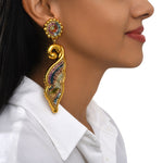 Emblématique de la collection Angèle, cette paire de boucles d’oreilles clip se distingue par son top rond brodé prolongé d’un pendant allongé, signature graphique de la ligne. Entièrement recouvertes de broderies faites main, elles dévoilent un travail minutieux où sequins, perles, paillettes et strass sont cousus un à un pour former de riches arabesques. Le coloris multicolore mêle nuances de bleus, touches de vert, éclats dorés et rose lumineux dans une harmonie vibrante. Élégantes et légères, ces boucles d’oreilles captent la lumière à chaque mouvement et incarnent l’esprit couture, précieux et contemporain de la collection Angèle.