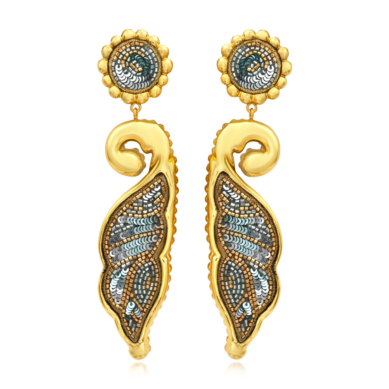 Emblématique de la collection Angèle, cette paire de boucles d’oreilles clip se distingue par son top rond brodé prolongé d’un pendant allongé, signature graphique de la ligne. Entièrement recouvertes de broderies faites main, elles révèlent un travail d’une grande finesse, où sequins, perles, paillettes et strass sont cousus un à un pour dessiner de délicates arabesques. Le coloris turquoise décline une harmonie lumineuse de bleus intenses et de reflets éclatants, apportant fraîcheur et profondeur à la silhouette. Élégantes et légères, ces boucles d’oreilles incarnent l’esprit couture, artisanal et contemporain de la collection Angèle.