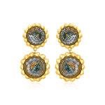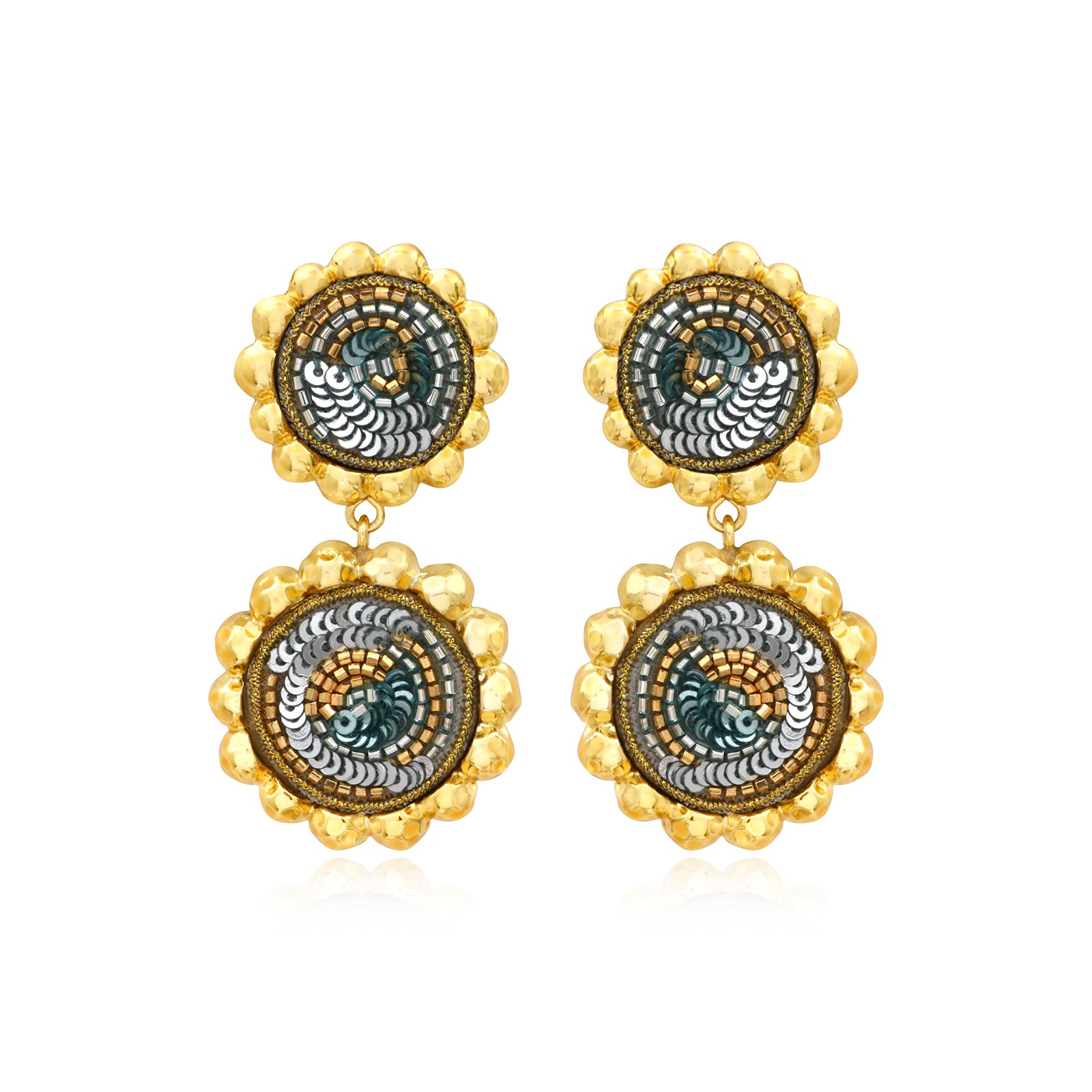 Élégantes et lumineuses, les boucles d’oreilles Angèle déclinent la forme ronde dans une silhouette harmonieuse et emblématique de la collection. Leur top rond brodé se prolonge par un pendant assorti, créant un équilibre graphique tout en douceur. Entièrement recouvertes de broderies faites main, elles révèlent un travail minutieux où sequins, perles, paillettes et strass sont cousus un à un pour dessiner de délicates arabesques. Le coloris turquoise offre une profondeur intense et lumineuse, apportant fraîcheur et éclat au visage. Légères et raffinées, ces boucles d’oreilles incarnent l’esprit couture, artisanal et contemporain de la collection Angèle.