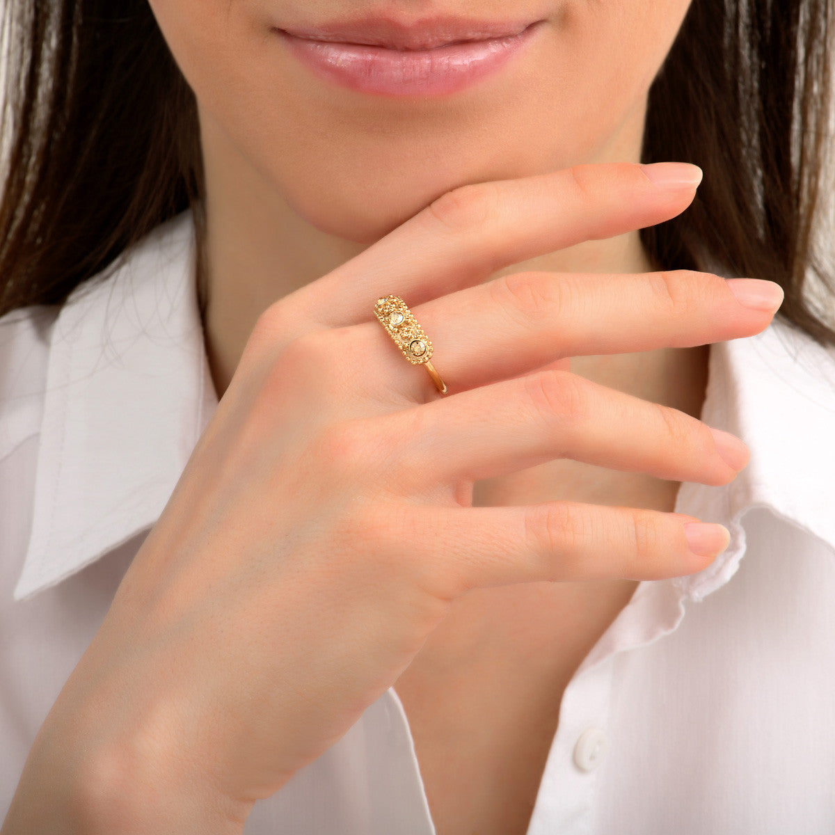 Si vous êtes à la recherche d'une bague féminine facile à porter en toutes circonstances, cette fine bague Farah saura vous séduire. Réalisée en métal doré à l'or fin, cette bague fantaisie se pare de cristaux étincelants qui mettront en lumière votre silhouette. Telle une dentelle de métal, cette bague épouse le contour de votre doigt avec grâce.