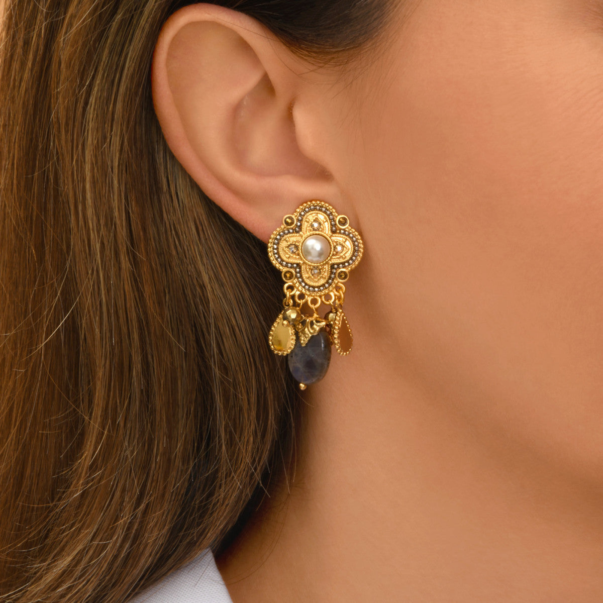 Labradorite, cabochons nacrés et hématite dorée donnent vie à un bijou comme nul autre grâce à l'imagination de la Maison Satellite Paris et au savoir-faire de ses artisans bijoutiers. Portées en journée ou à l'occasion d'une soirée, ces clips d'oreilles Positano en métal doré à l'or 18 carats et métal argenté vous assurent d'attirer tous les regards sur votre tenue.
