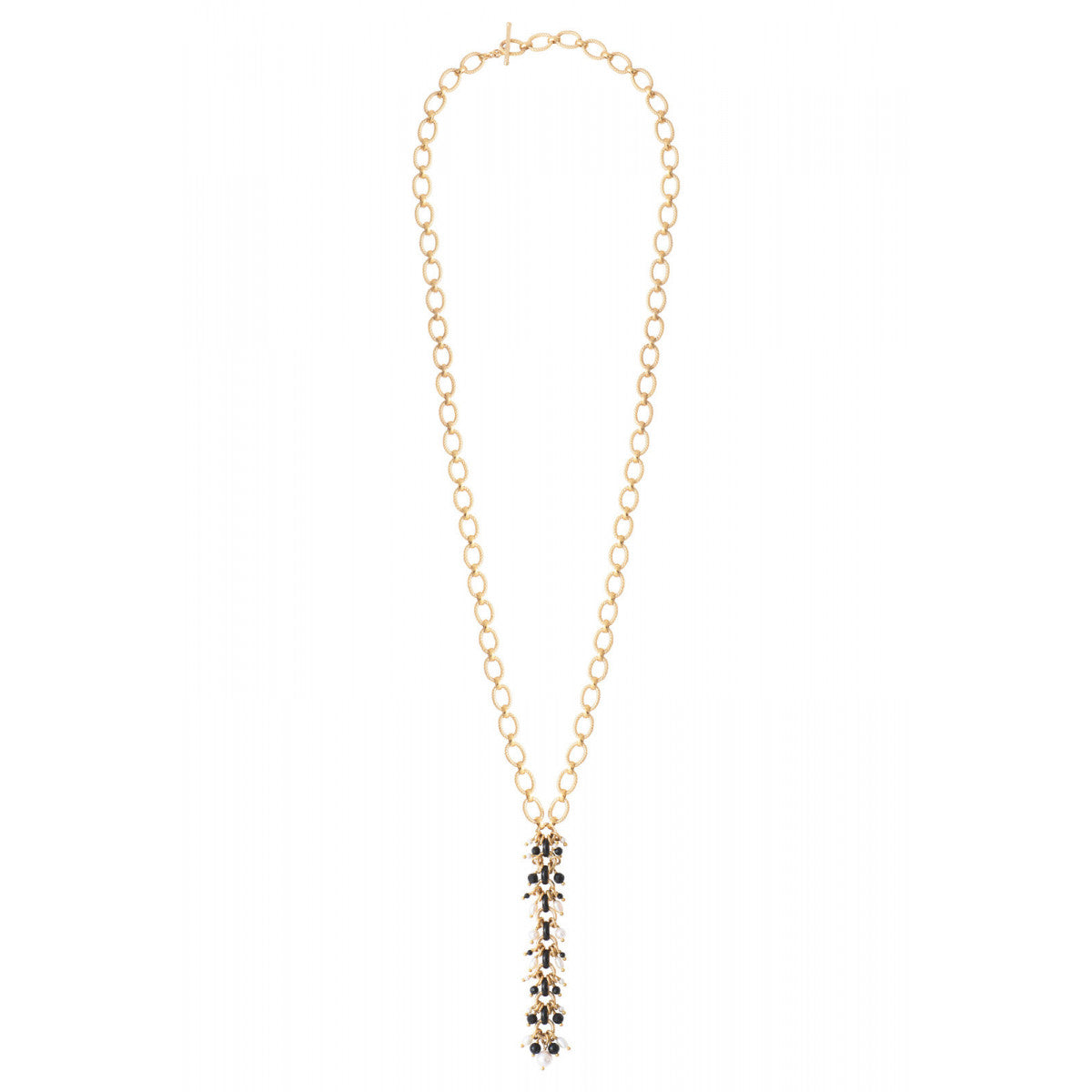 This sophisticated sautoir necklace is distinguished by its wide links, delicately crafted in our workshops. Its graphic pendant, composed of freshwater pearls, onyx beads, and mother-of-pearl beads, lends this feminine piece a rare elegance. Ideal for an evening out or a formal cocktail party, this women's sautoir will elevate your look in an instant.