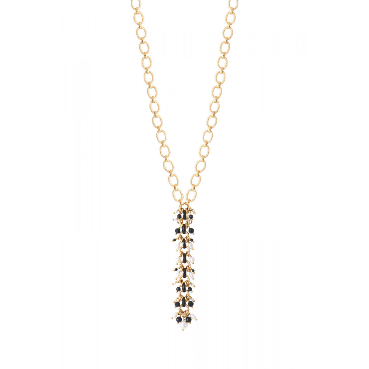 Sautoir chaîne précieux perles de rivière et onyx - noir Noir blanc