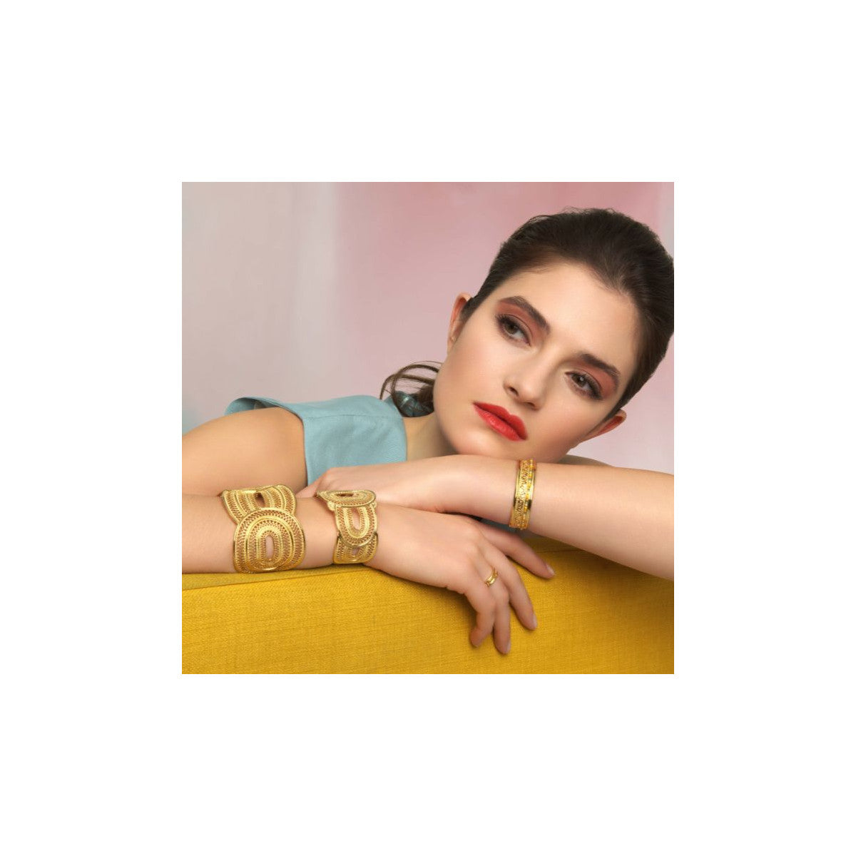 This maxi cuff bracelet is a real head-turner! Meticulously crafted using the filigree technique, this wide bracelet beautifully accentuates the Satellite woman. The brilliance of the 18-karat gold-plated metal is enhanced by the interplay of light in this elegantly openwork piece. This adjustable-width cuff rests on the skin like delicate lace.